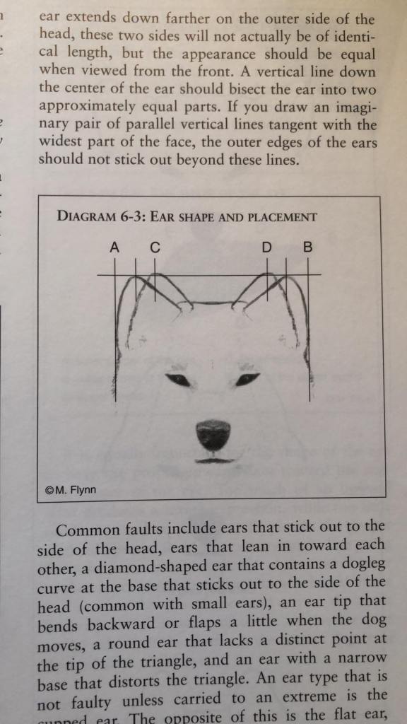 Crâne large et plat avec un léger sillon. Joues bien développées. Stop modéré. Museau plein et rond s’amenuisant légèrement vers une truffe noire. Le museau comprend 40% de la longueur totale de la tête. La voûte du nez est droite, la mâchoire inférieure forte. Les lèvres sont serrées et noires. Les dents sont grosses, fortes, avec un articulé en ciseaux et une dentition complète. Les dents manquantes doivent être pénalisées (notez que les prémolaires sont le plus souvent absentes). L’absence de cinq dents ou plus entraîne une disqualification. Yeux relativement petits, triangulaires, bien écartés, obliques (les commissures externes relevées) et de couleur brun foncé avec le contour de l’oeil noir. Oreilles petites, épaisses, triangulaires, bien fournies, inclinées légèrement vers l’avant et bien dressées.